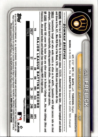 2024 Sal Frelick Topps Bowman Chrome MEGA BOX AQUA REFRACTOR ROOKIE 32/125 Milwaukee Brewers #39