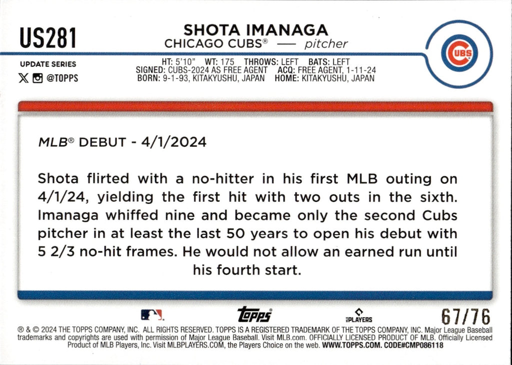 2024 Shota Imanaga Topps Update INDEPENDENCE DAY ROOKIE 67/76 RC #US281 Chicago Cubs