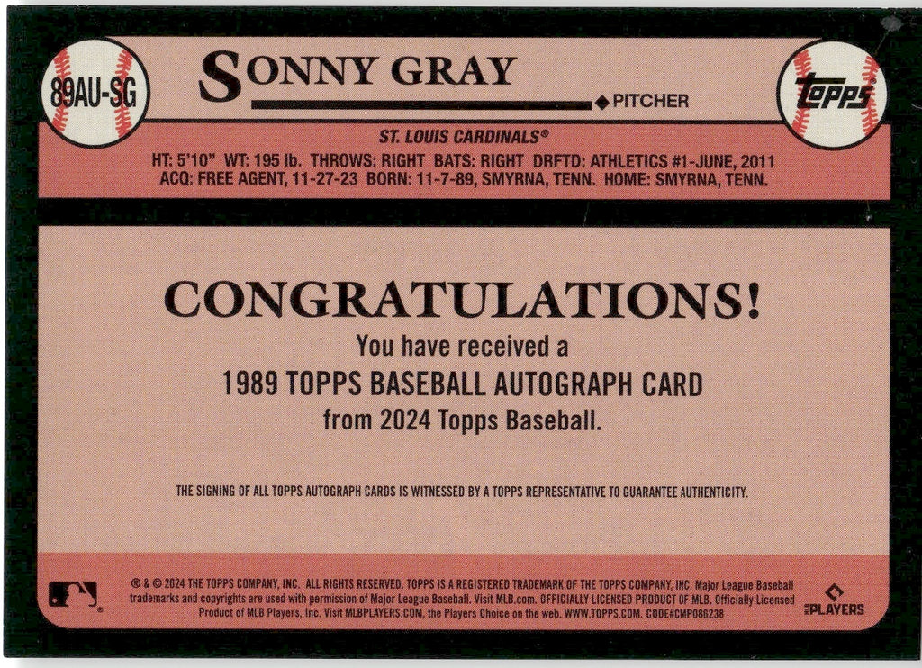 2024 Sonny Gray Topps 1989 DESIGN AUTOGRAPH AUTO #89AU-SG St. Louis Cardinals