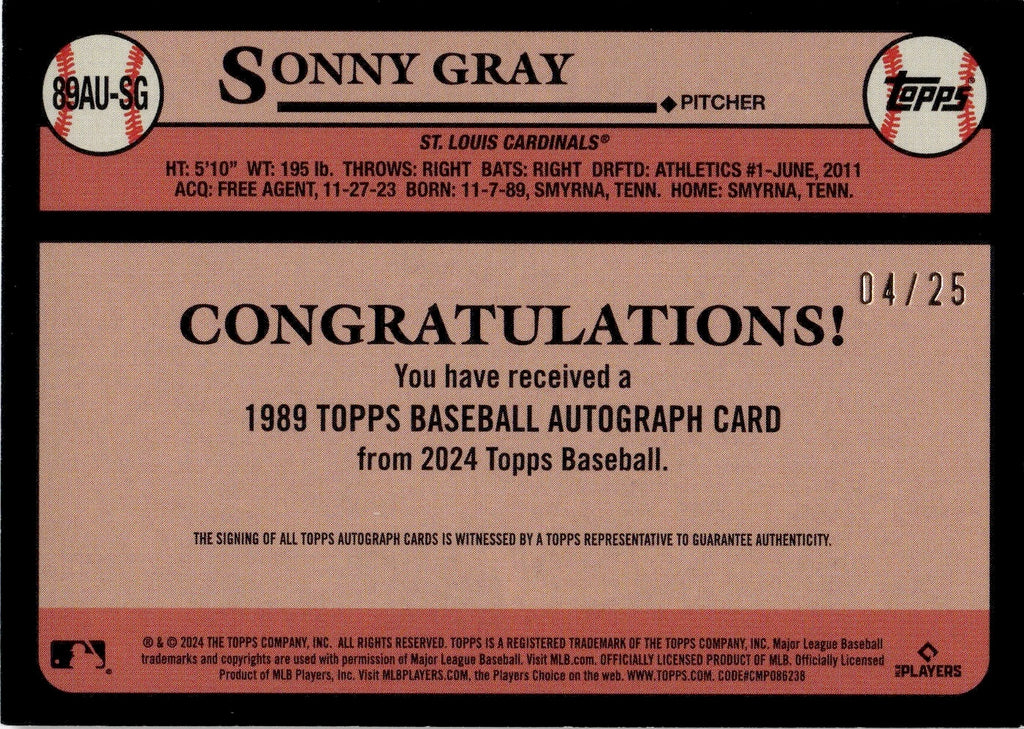 2024 Sonny Gray Topps 1989 DESIGN RED BORDER AUTO02/25 AUTOGRAPH #89AU-SG St. Louis Cardinals