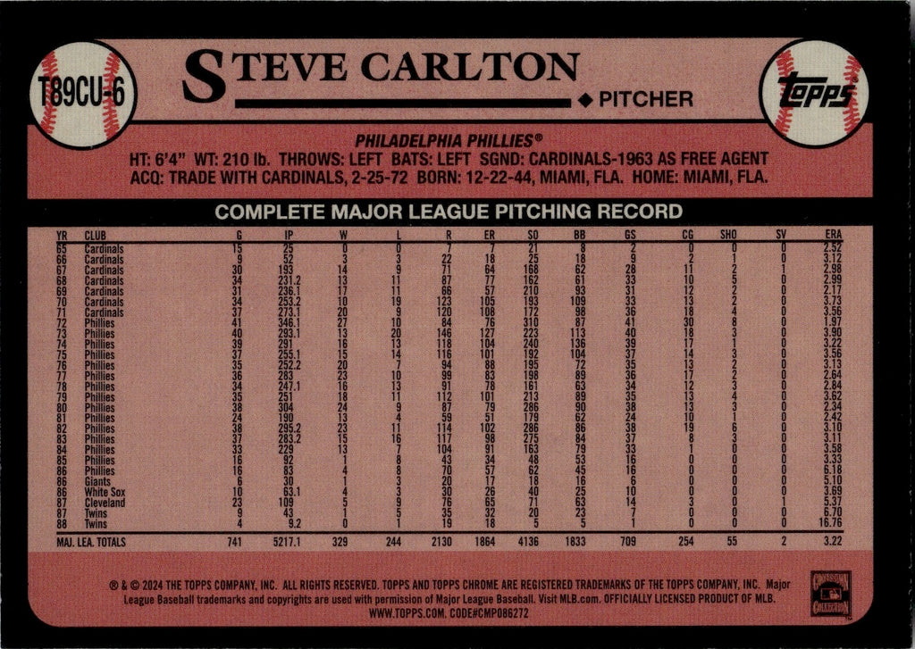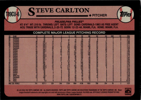 2024 Steve Carlton Topps Chrome Silver Pack 1989 DESIGN PURPLE REFRACTOR 75/75 #T89CU-6 Philadelphia Phillies HOF