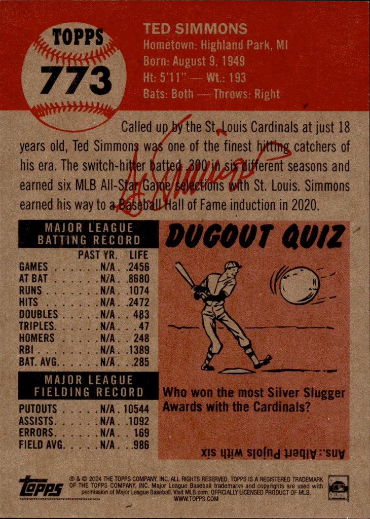 2024 Ted Simmons Topps Living Set /1471 #773 St. Louis Cardinals HOF 8