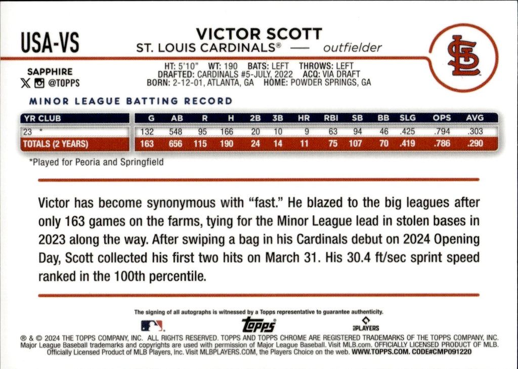 2024 Victor Scott II Topps Chrome Update Sapphire Edition GREEN REFRACTOR ROOKIE AUTO 28/99 AUTOGRAPH RC #USA-VS St. Louis Cardinals