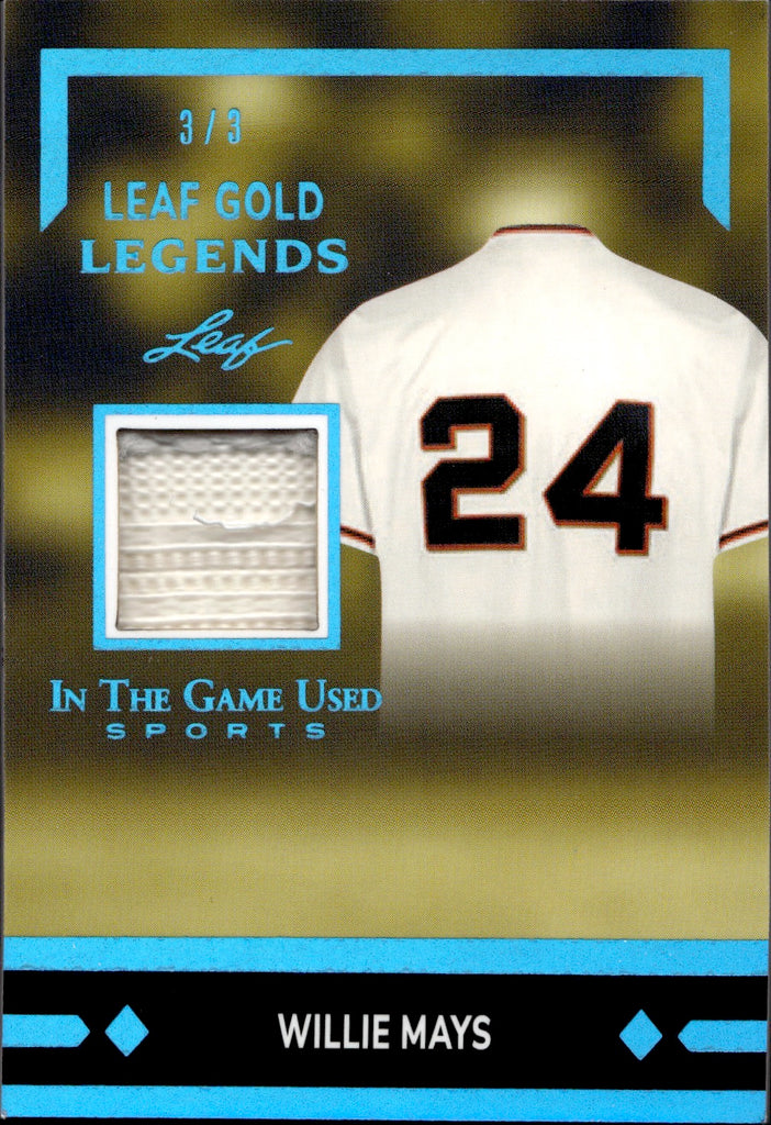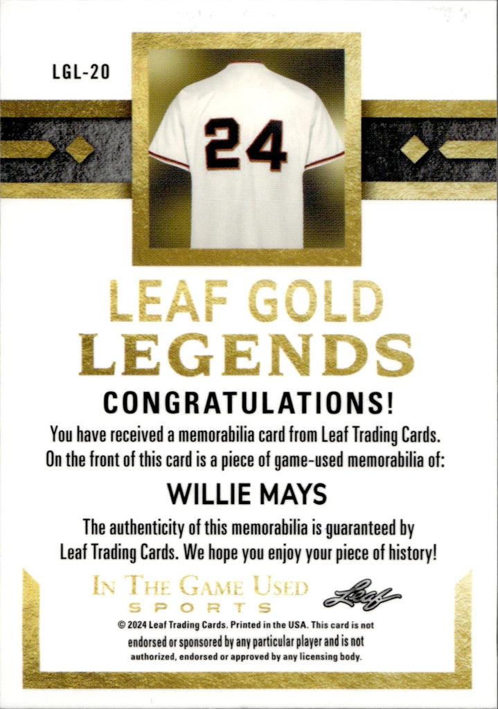2024 Willie Mays Leaf In the Game Used PLATINUM GOLD LEGENDS JERSEY 3/3 RELIC #LGL-20 San Francisco Giants HOF