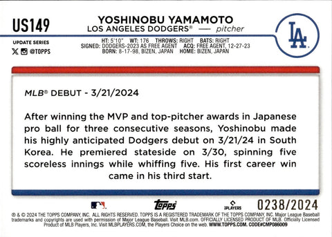 2024 Yoshinobu Yamamoto Topps Update Series GOLD BORDER ROOKIE 0238/2024 RC #US149 Los Angeles Dodgers