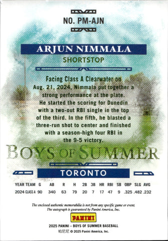 2025 Arjun Nimmala Panini Boys Of Summer PROSPECT MATERIAL SIGNATURES JERSEY AUTO 88/99 AUTOGRAPH #PM-AJN Toronto Blue Jays