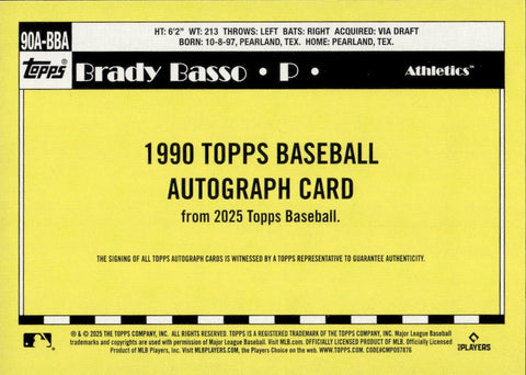 2025 Brady Basso Topps 1990 DESIGN AUTOGRAPH ROOKIE AUTO RC #90A-BBA Oakland A's