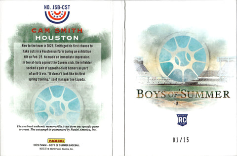 2025 Cam Smith Panini Boys of Summer ROOKIE JUMBO PATCH AUTO 01/15 AUTOGRAPH RELIC RC BOOKLET #JSB-CST Houston Astros