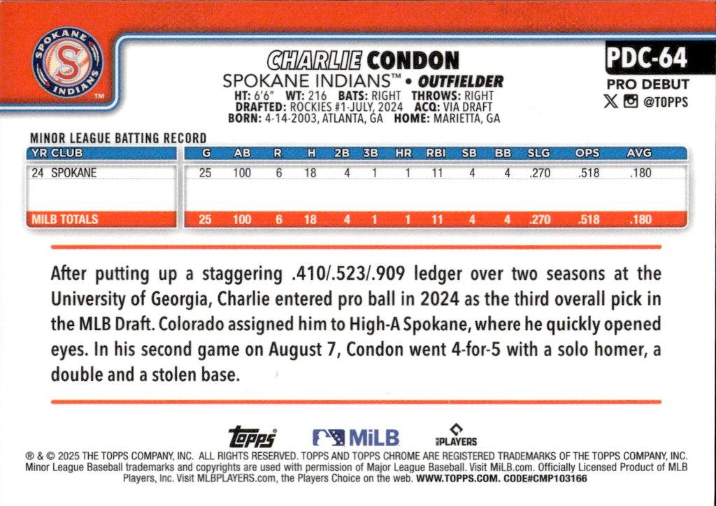 2025 Charlie Condon Topps Pro Debut Chrome BLACK WAVE REFRACTOR 10/10 #PDC-64 Colorado Rockies Spokane Indians