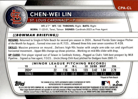 2025 Chen-Wei Lin Bowman Chrome 1ST BOWMAN AUTO AUTOGRAPH #CPA-CL St. Louis Cardinals