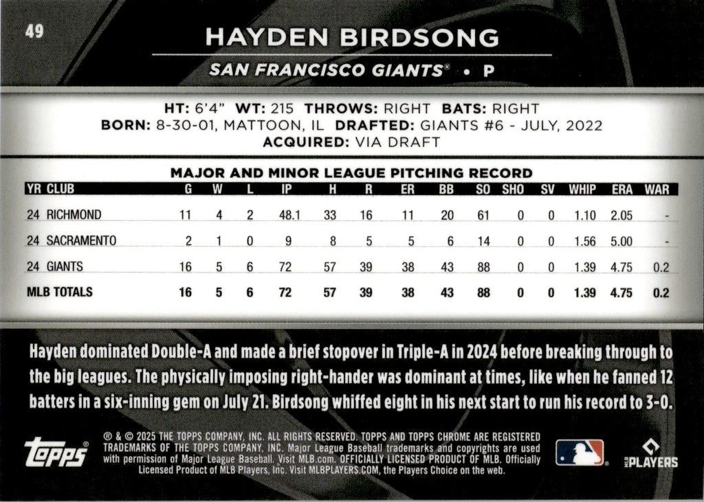 2025 Hayden Birdsong Topps Chrome Black ROOKIE DESIGN VARIATION PURPLE REFRACTOR 24/75 RC #49 San Francsico Giants