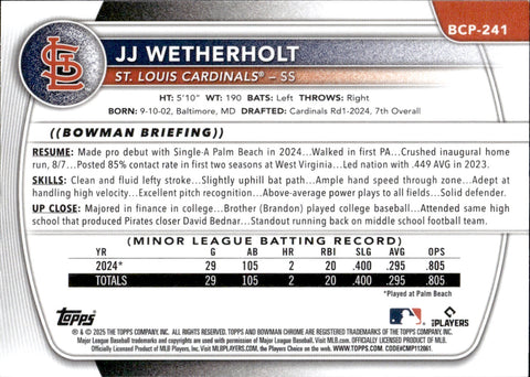 2025 JJ Wetherholt Bowman Chrome PROSPECTS GREEN GEOMETRIC REFRACTOR ROOKIE RC 18/99 #BCP-241 St. Louis Cardinals