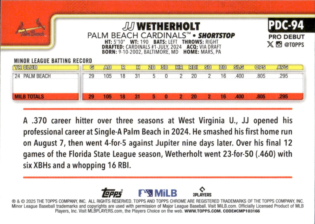 2025 JJ Wetherholt Topps Pro Debut CHROME GREEN FOIL REFRACTOR 53/99 #PDC-94 St. Louis Cardinals
