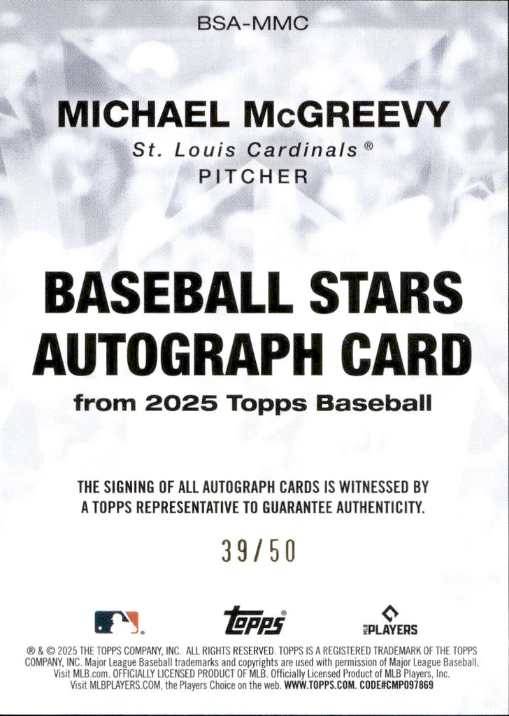 2025 Michael Mcgreevy Topps BASEBALL STARS GOLD ROOKIE AUTOGRAPH 39/50 AUTO RC #BSA-MMC St. Louis Cardinals