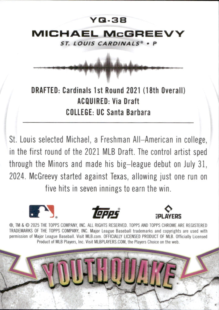 2025 Michael McGreevy Topps Chrome YOUTHQUAKE GREEN REFRACTOR ROOKIE 25/99 RC #YQ-38 St. Louis Cardinals