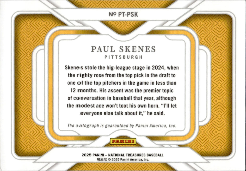 2025 Paul Skenes Panini National Treasures PERSONALIZED TREASURES AUTO 68/99 AUTOGRAPH #PT-PSK Pittsbirgh Pirates