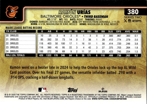 2025 Roman Urias Topps Series 2 GOLDEN MIRROR IMAGE VARIATION #380 Baltimore Orioles