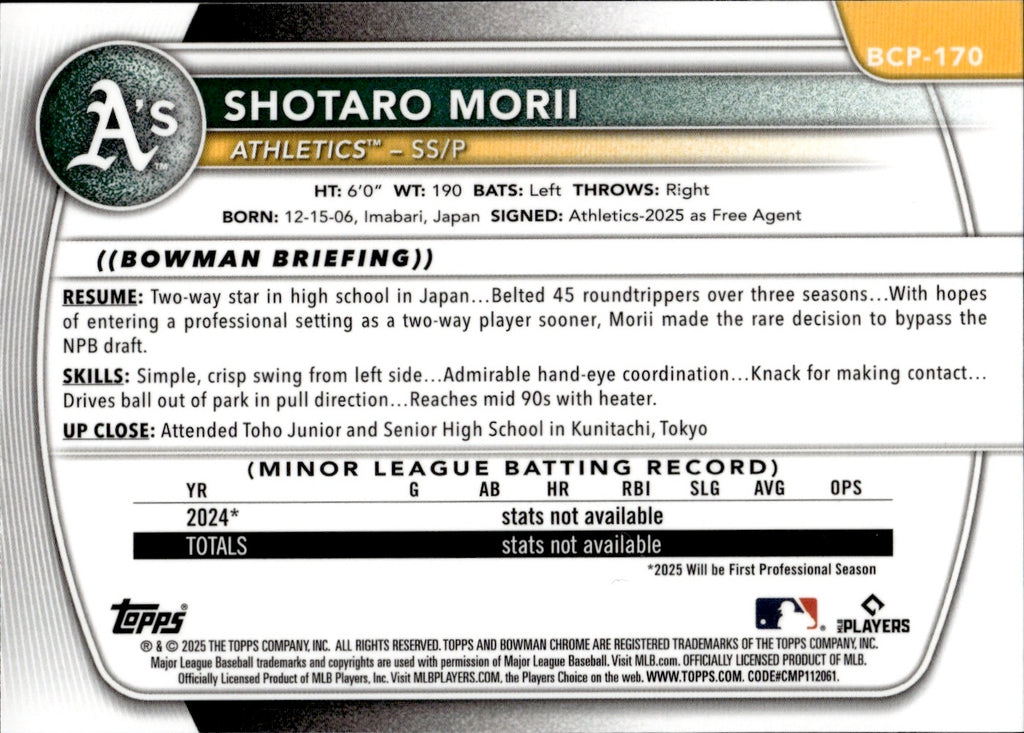2025 Shotaro Morii Bowman Chrome 1ST BOWMAN PROSPECTS PULSAR REFRACTOR 232/399 #BCP-170 Oakland A's