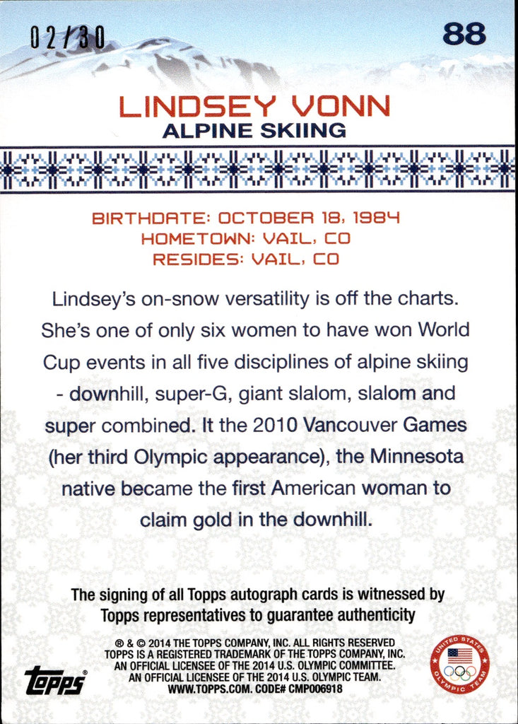 2014 Lindsey Vonn TOpps U.S. Olympic & Paralympic Team and Hopefuls SILVER AUTO 02/30 AUTOGRAPH #88 Alpine Skiing