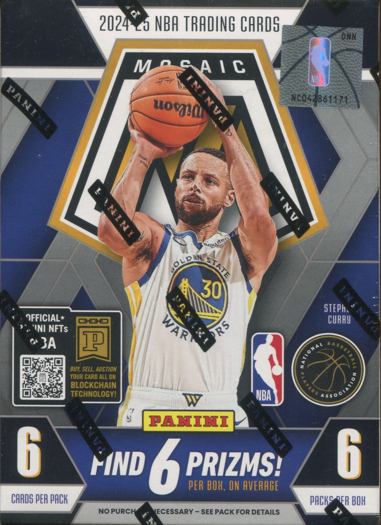 Panini's Mosaic Basketball is back for the 2024-25 season! Each blaster contains 6 packs containing 6 cards each! Find 6 Prizms per box on average! Look for the Ultra-Rare Mosaic Genesis Prizms! Look for the New Ultra-Rare Retail Exclusive Full Capacity Insert!
