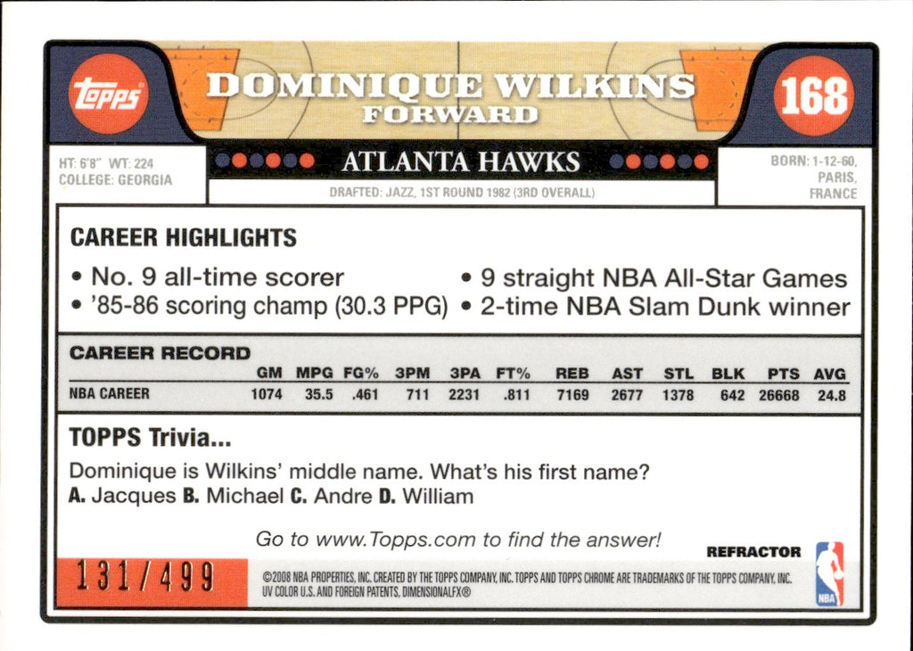 2008-09 Dominique Wilkens Topps Chrome REFRACTORS ORANGE 131/499 #168 Atlanta Hawks
