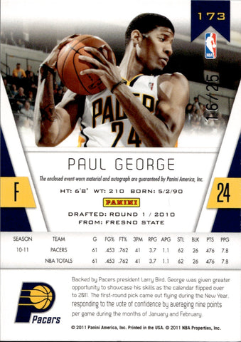 2010-11 Paul George Panini Totally Certified GOLD PATCH AUTO 16/25 AUTOGRAPH RELIC #173 Indiana Pacers