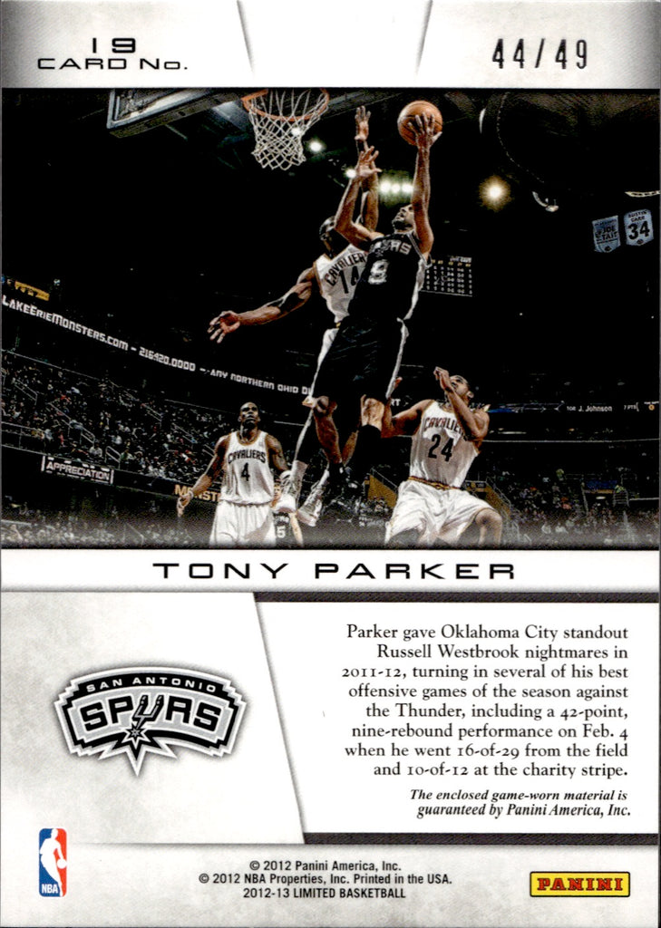 2012-13 Tony Parker Panini Limited LIGHTS OUT JERSEY 44/49 RELIC #19 San Antonio Spurs HOF