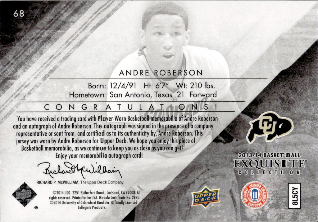 2013-14 Andre Roberson Upper Deck Exquisite JERSEY PATCH AUTO 181/199 Colorado Buffaloes #68