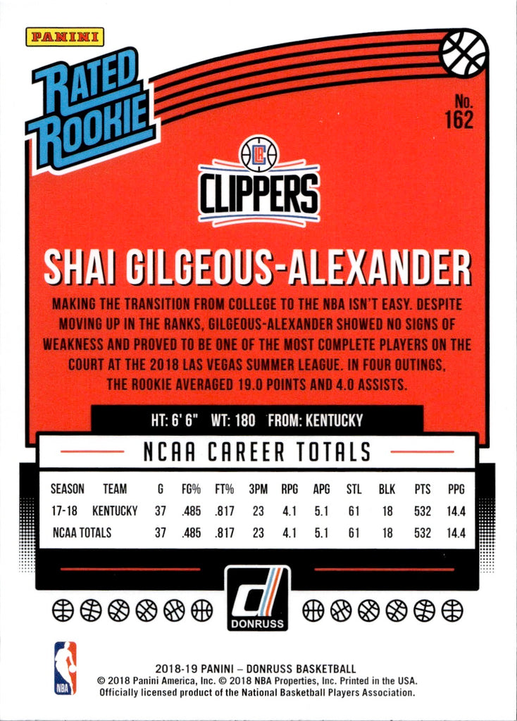 2018-19 Shai Gilgeous-Alexander Panini Donruss ROOKIE Los Angeles Clippers #162 1