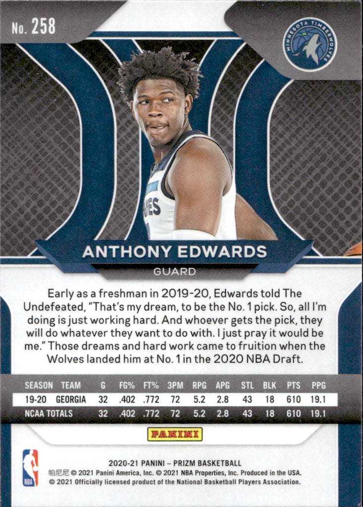 2020-21 Anthony Edwards Panini Prizm ROOKIE RC #258 Minnesota Timberwolves