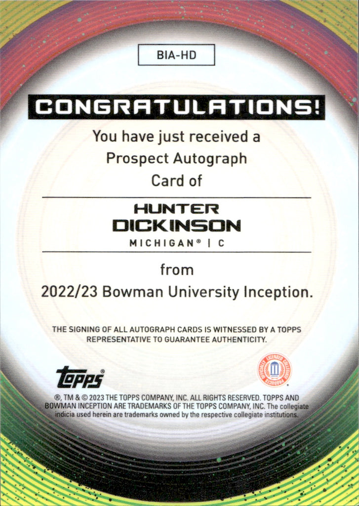 2022-23 Hunter Dickinson Bowman University Inception PROSPECT AUTOGRAPH AUTO #BIA-HD Michigan Wolverines