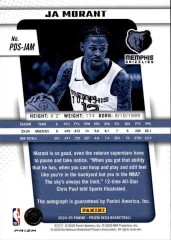2024-25 Ja Morant Panini Prizm Deca PURPLE AUTO 10/49 AUTOGRAPH #PDS-JAM Memphis Grizzlies