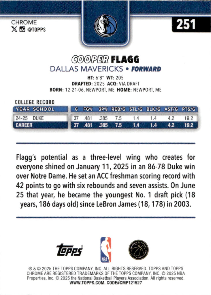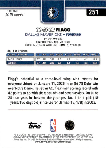 2025-26 Cooper Flagg Topps Chrome ROOKIE RC #251 Dallas Mavericks