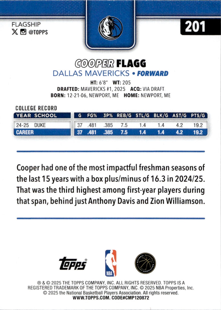 2025-26 Cooper Flagg Topps ROOKIE RC #201 Dallas Mavericks 1