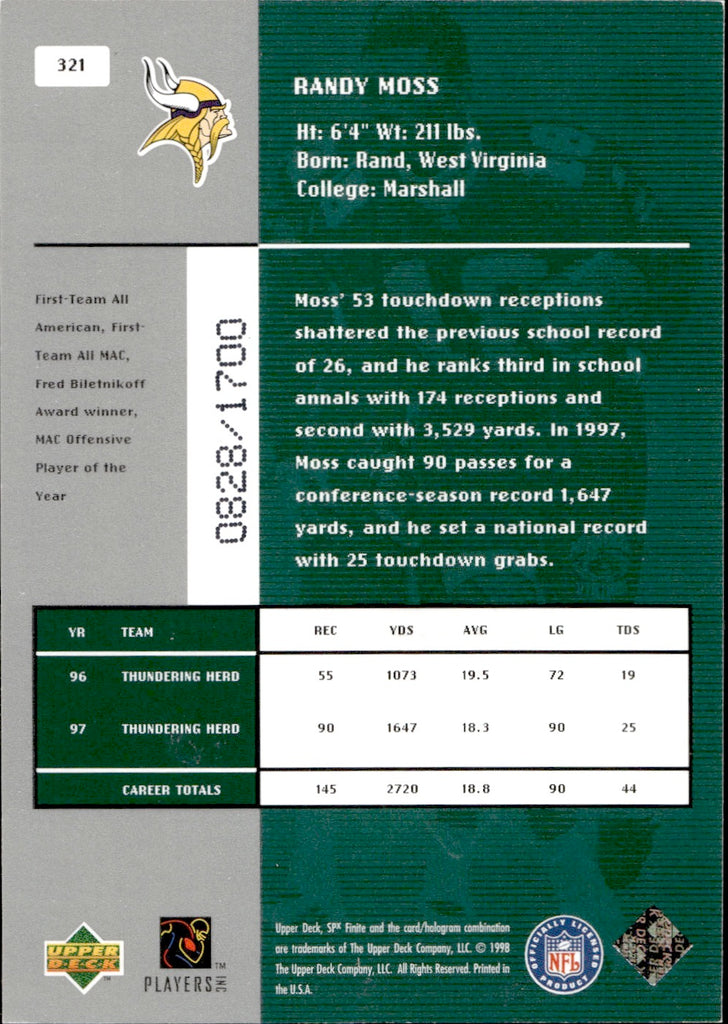 1998 Randy Moss Upper Deck SPx Finite THE NEW SCHOOL ROOKIE 828/1700 RC #321 Minnesota Vikings
