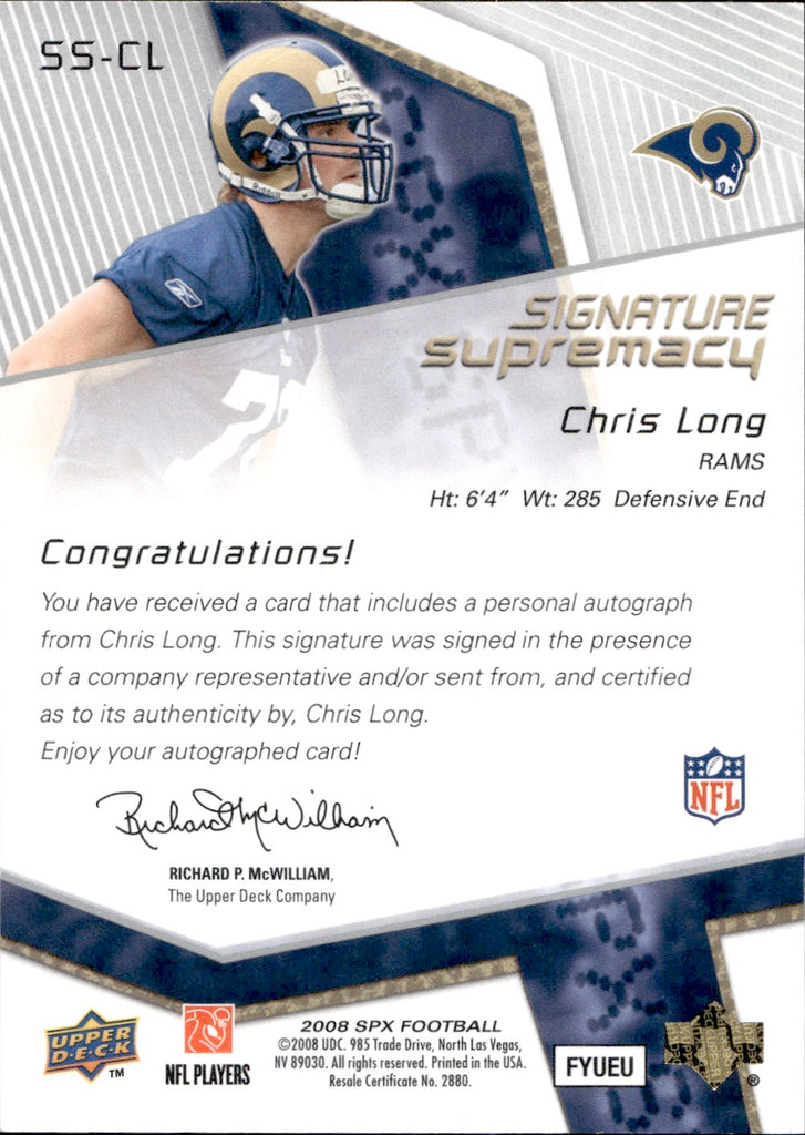 2008 Chris Long Upper Deck SPx SIGNATURE SUPREMACY AUTOGRAPH ROOKIE AUTO RC #SS-CL St. Louis Rams