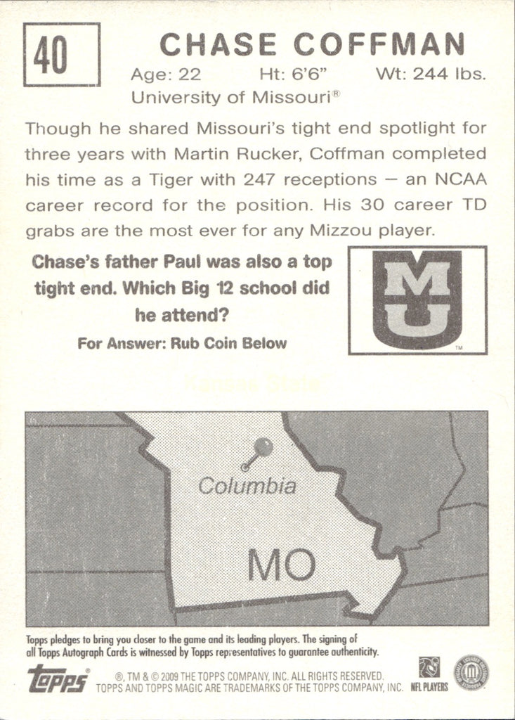 2009 Chase Coffman Topps Magic ROOKIE AUTOGRAPH RC AUTO #40 Missouri Tigers Cincinnati Bengals