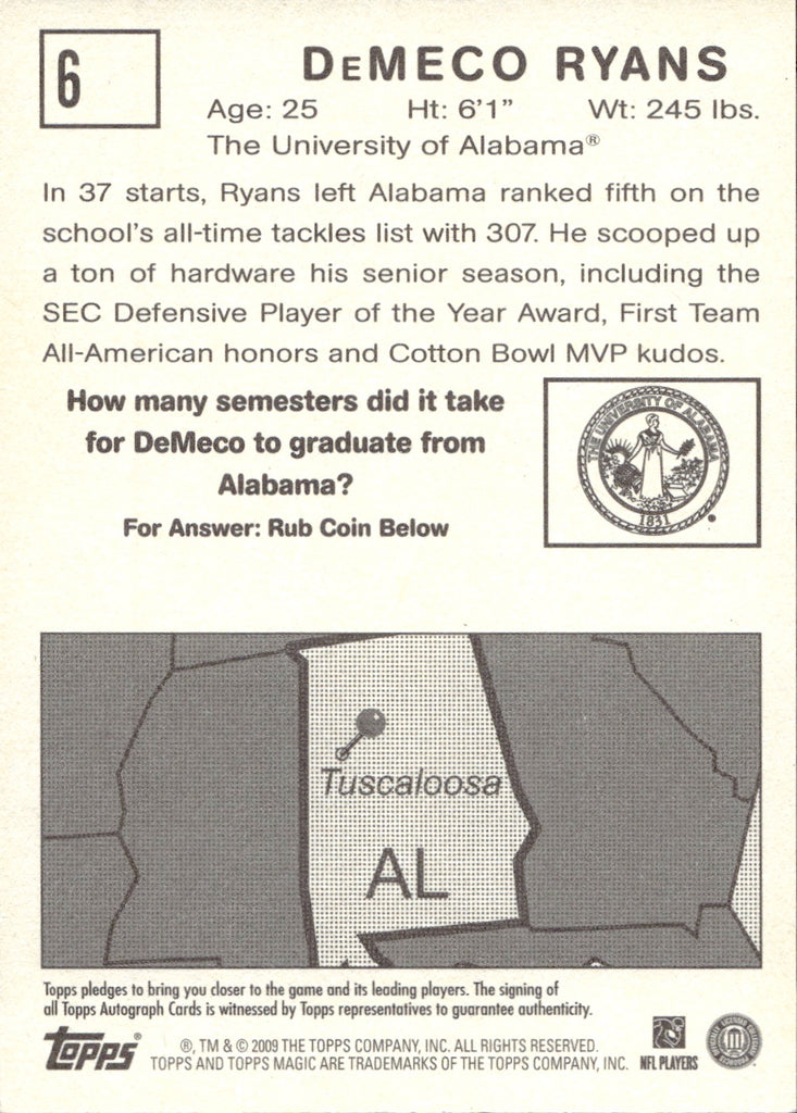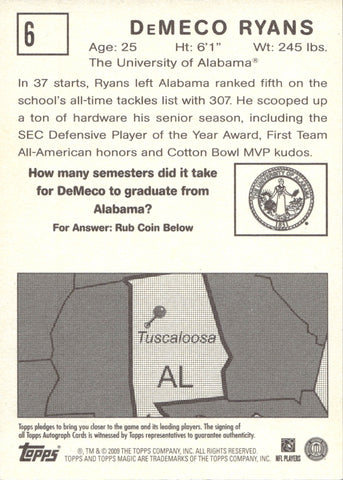 2009 DeMeco Ryans Topps Magic ROOKIE AUTOGRAPH RC AUTO #6 Alabama Crimson Tide Houston Texans