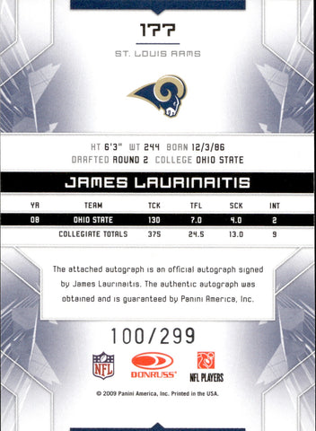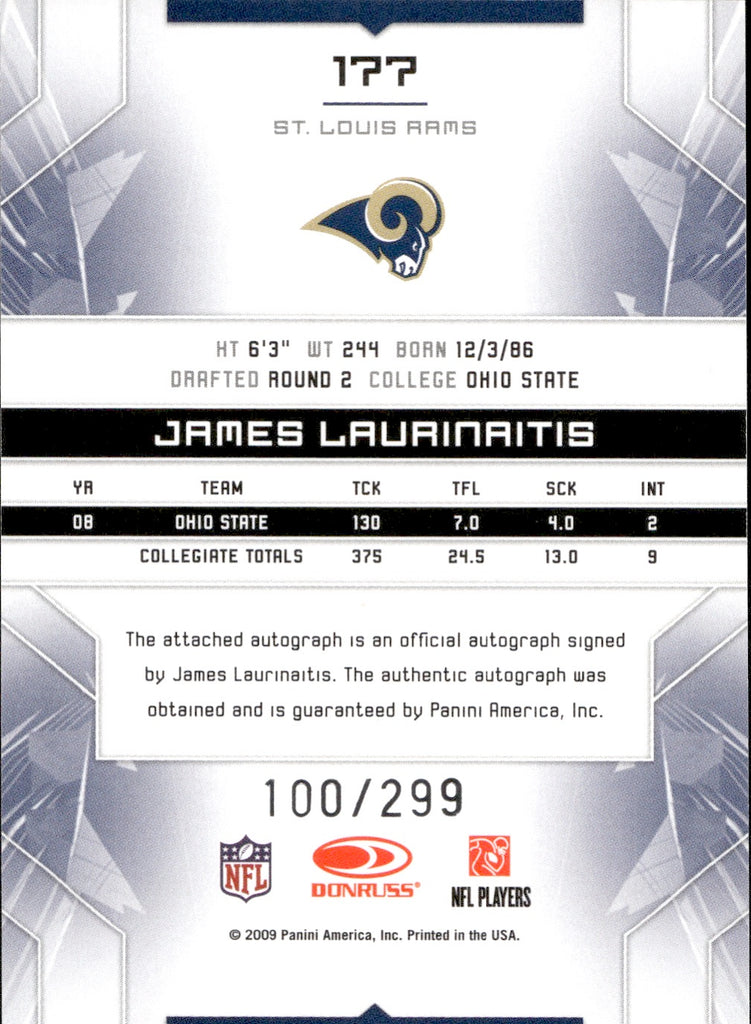 2009 James Laurinaitis Donruss Limited PHENOMS ROOKIE AUTOGRAPH 100/299 RC AUTO #177 St. Louis Rams