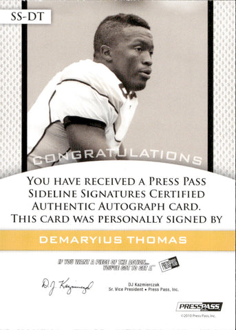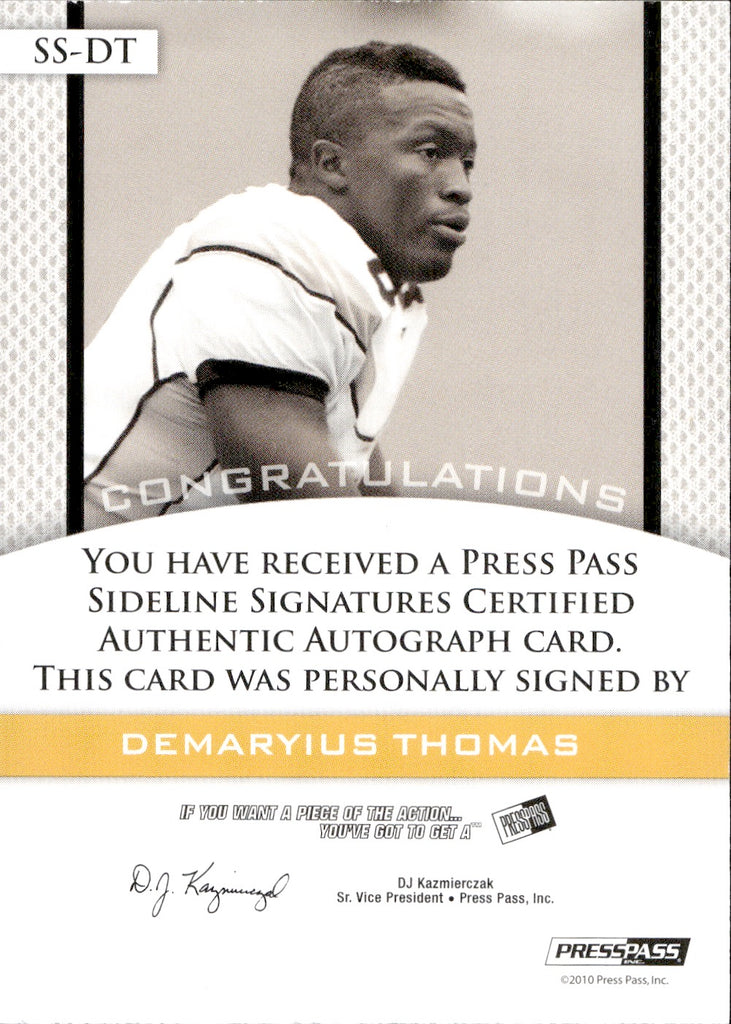 2010 Demaryius Thomas Press Pass SIDELINE SIGNATURES ROOKIE AUTOGRAPH RC AUTO #SS-DT Georgia Tech Yellow Jackets Denver Broncos