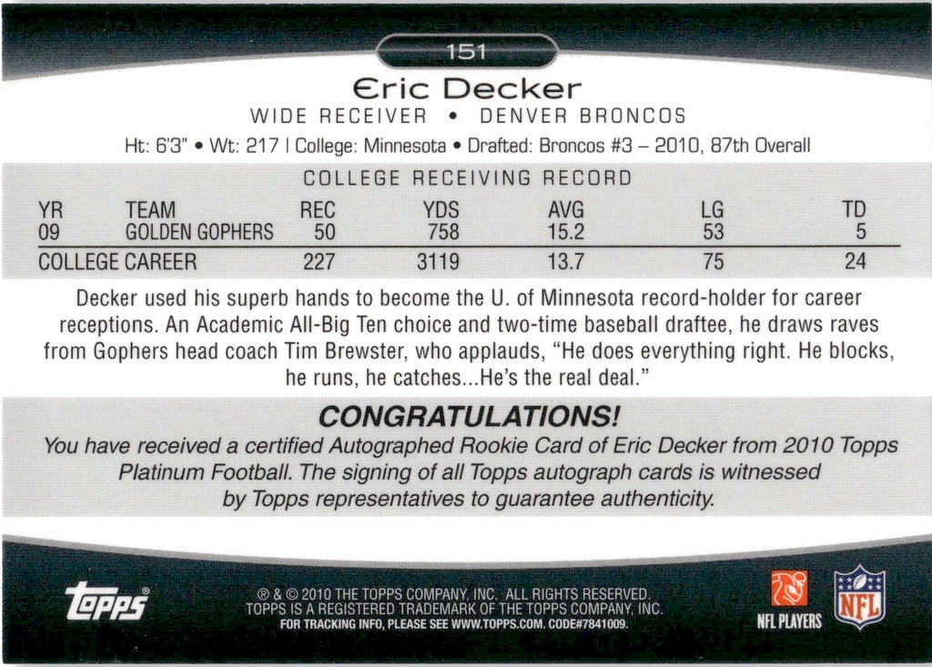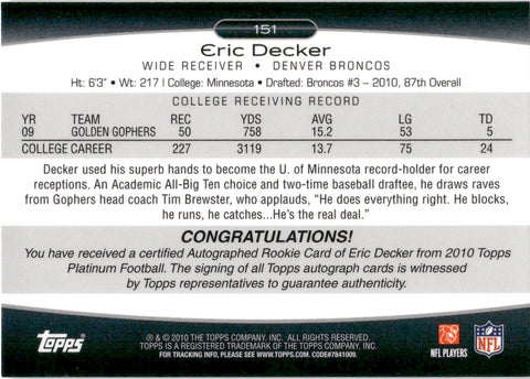 2010 Eric Decker Topps Platinum AUTOGRAPH ROOKIE RC AUTO 374/900 #151 Denver Broncos