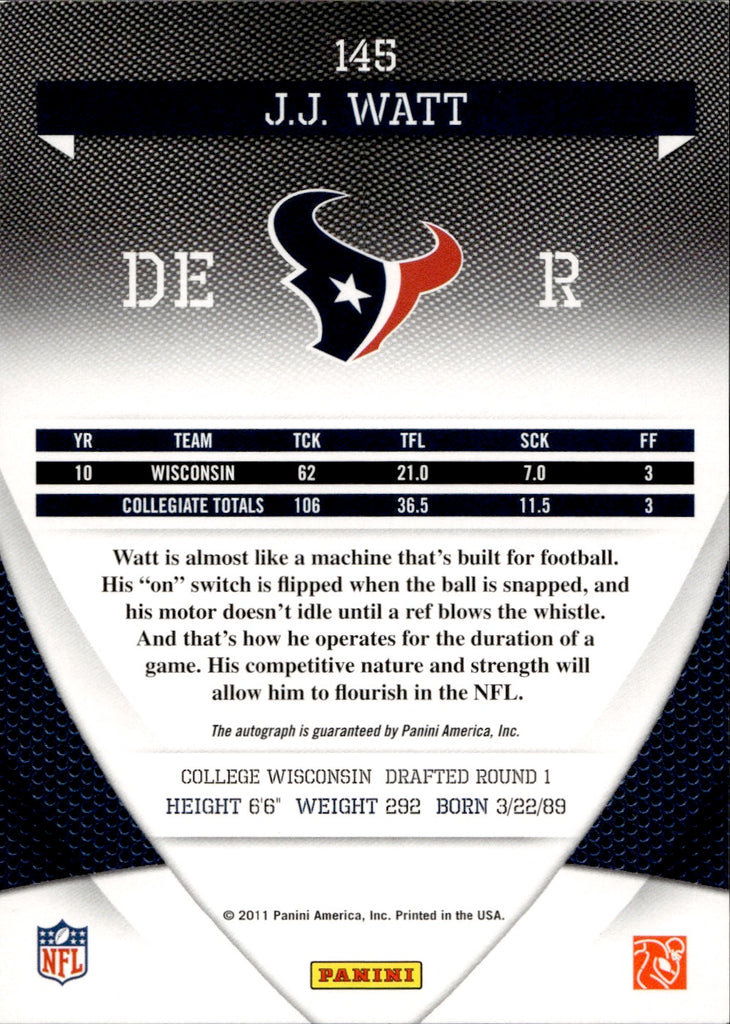 2011 J.J. Watt Donruss Elite TURN OF THE CENTURY ROOKIE AUTO 096/499 AUTOGRAPH #145 Houston Texans