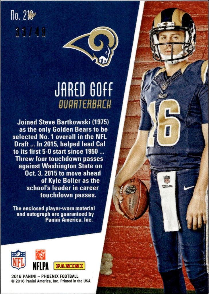 2016 Jared Goff Panini Phoenix ROOKIE JERSEY AUTO 33/49 AUTOGRAPH RELIC RC #218 Los Angeles Rams