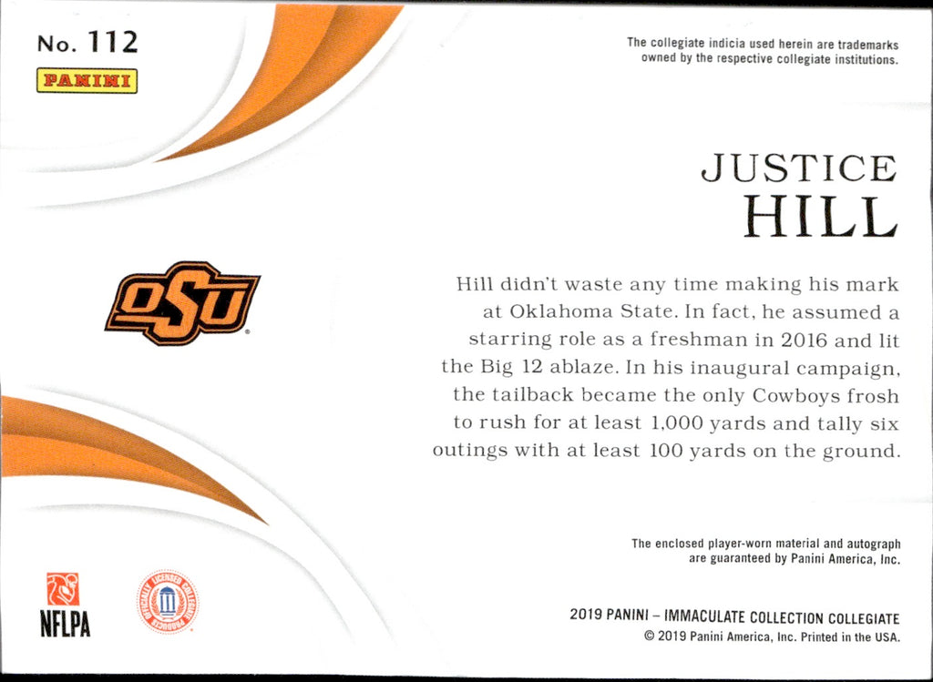 2019 Justice Hill Panini Immaculate Collection Collegiate AUTOGRAPH PATCH ROOKIE AUTO RC 23/25 #112 Oklahoma State Cowboys Baltimore Ravens