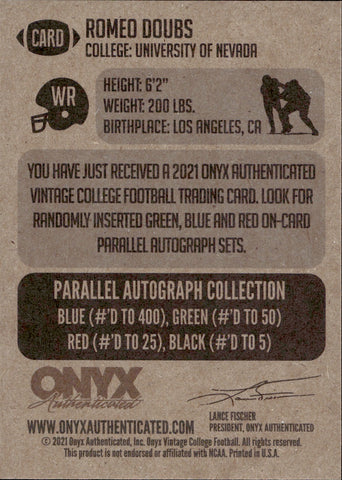 2021 Romeo Doubs Onyx AUTOGRAPH ROOKIE AUTO RC /400 Green Bay Packers Nevada University Wolf Pack