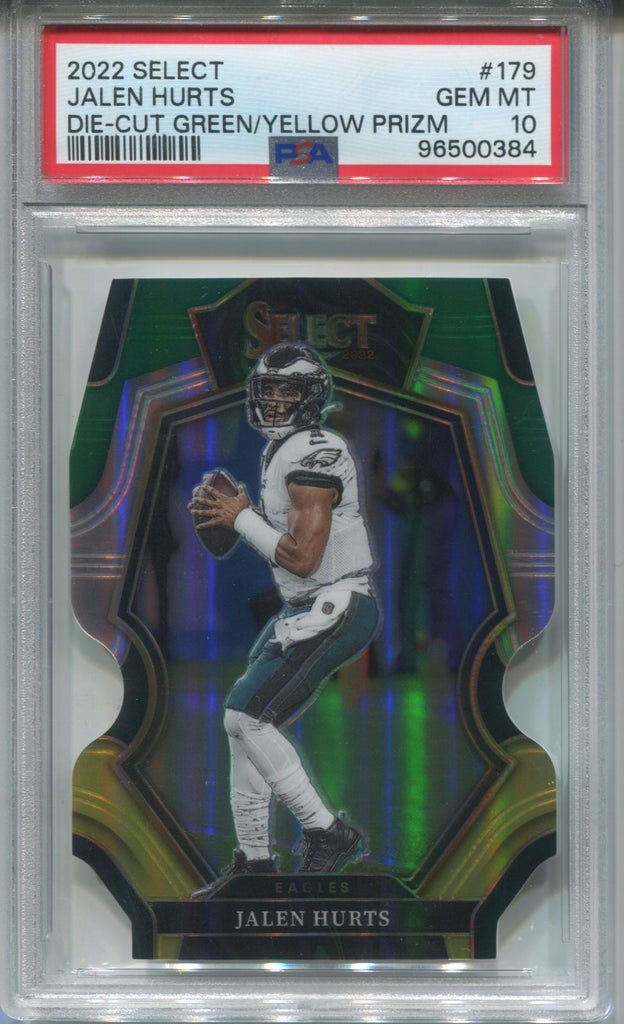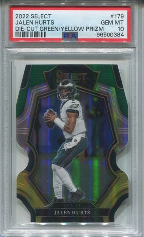 2022 Jalen Hurts Panini Select PREMIER LEVEL DIE CUT GREEN YELLOW PRIZM PSA 10 #179 Philadelphia Eagles 0384
