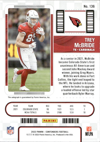2022 Trey McBride Panini Contenders ROOKIE TICKET AUTOGRAPH RC AUTO #136 Arizona Cardinals