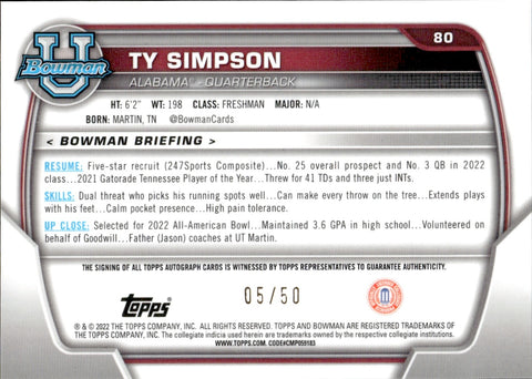2022 Ty Simpson Bowman University Chrome 1ST BOWMAN GOLD REFRACTOR AUTO 05/50 AUTOGRAPH #80 Alabama Crimson Tide