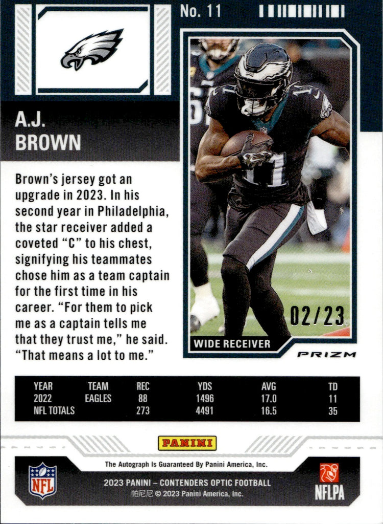 2023 A.J. Brown Panini Zenith CONTENDERS OPTIC PREVIEW VETERAN TICKET BLUE AUTO 02/23 AUTOGRAPH #11 Philadelphia Eagles
