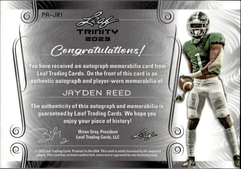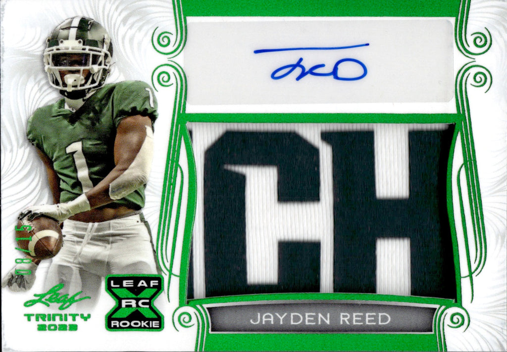 2023 Jayden Reed Leaf Trinity PATCH AUTOGRAPH EMERALD SPECTRUM XRC ROOKIE JERSEY AUTO 8/15 Green Bay Packers #PA-JR1